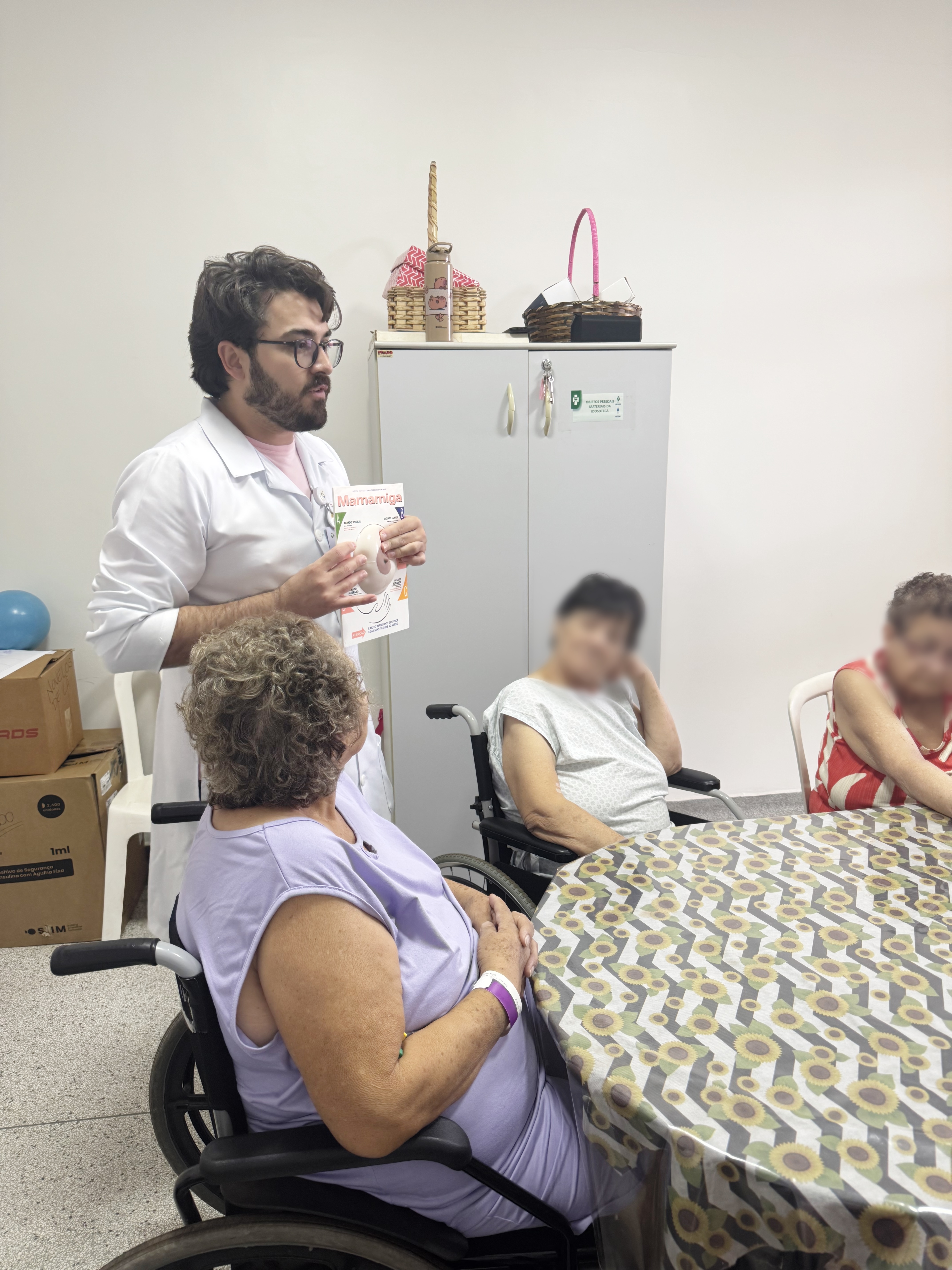 No HPA a equipe multiprofissional realizou a “Dinâmica da Caixa do Espelho”, atividade conduzida pelos serviços de Reabilitação e Fisioterapia, Psicologia e Nutrição. O encontro começou com abordagem informativa sobre o câncer de mama e a importância do autocuidado, seguida por reflexão simbólica sobre valorização da vida e prevenção. Para encerrar o Serviço de Fisioterapia promoveu animada sessão de “Musicoterapia”, unindo movimento e música para estimular bem-estar e integração entre os participantes.